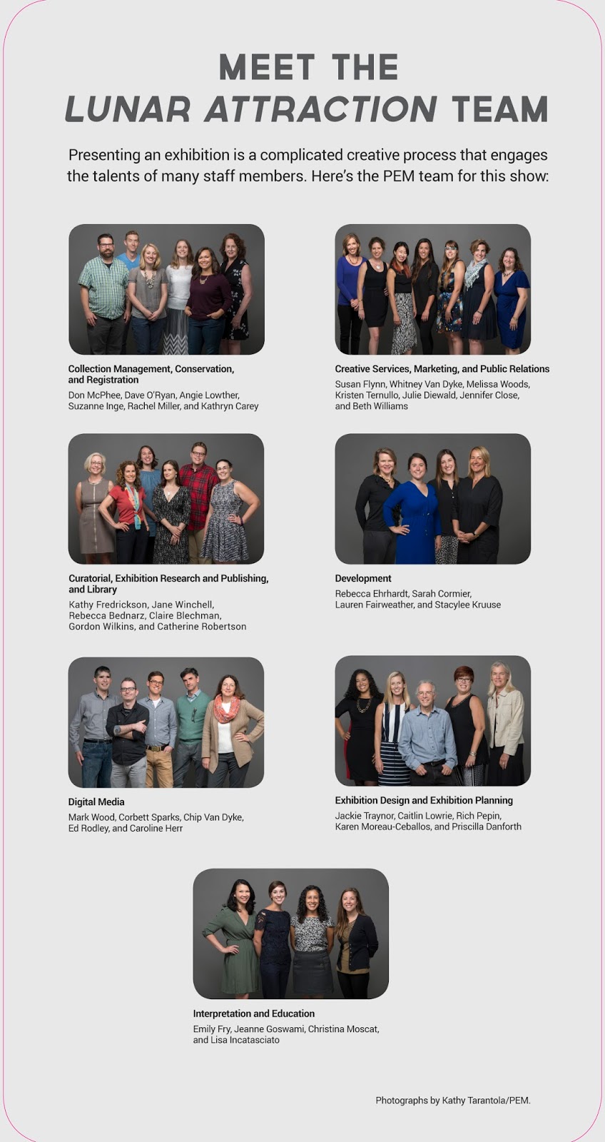 "It has been discussed. The question comes up periodically and I am certain it will come up again. We seem to fall on the "no need to print a thank you for doing your job. I don't see how you can thank exhibit staff without acknowledging development staff who raised the funds, education staff who carry out programming for the duration of the exhibit, marketing staff who make sure we're covered in the press, etc. We publicly acknowledge exhibit staff at opening event where donors and sponsors are present. We reserve panels for sponsors and donors."