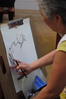 An educator provided a brief introduction--drop in life drawing, every Thursday in January, come to one or all, and here's the instructor. The instructor was great--because rather than beginning with a lecture about life drawing, he had everyone jump right in--start drawing, he said! And everyone, of all different abilities, began. And he began circulating the room, asking to sit where participants were seeing so he could see the model from their perspective. All of a sudden, surrounded by art, the room grew quiet as participants really looked and drew.