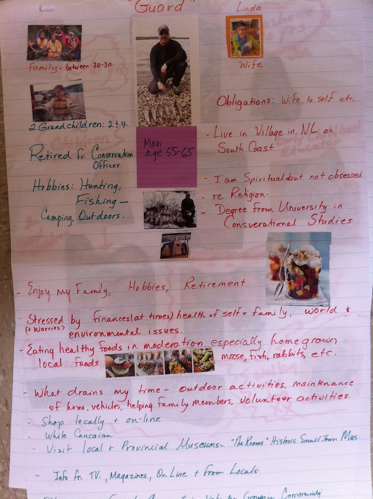 This was true in Newfoundland as well but a couple groups went deeper and their collages helped groups reach a deeper understanding of their potential audiences. Four of my five workshops in Newfoundland were in rural locations, with declining populations and I asked groups to develop profiles of older residents in their communities. In several profiles, older men had only an 8th grade education, as they had left school to help support their family by fishing, a common occurence for that generation ("no wonder they don't want those long labels!" said one participant). Because many Newfoundland men of working age now work away, in Alberta or on oil rigs (as they once went away to fish); older generations are particularly busy with childcare and family responsibilities. At one workshop a participant gained a great understanding from this--it was a park, and they had offered a special seniors day last year, with little impact. But now it will be a grandparents day, with grandparents encouraged to bring grandchildren to learn about natural history. What do older Newfoundlanders worry about? their health; who will take care of them; their children and grandchildren; the economy; and much more.